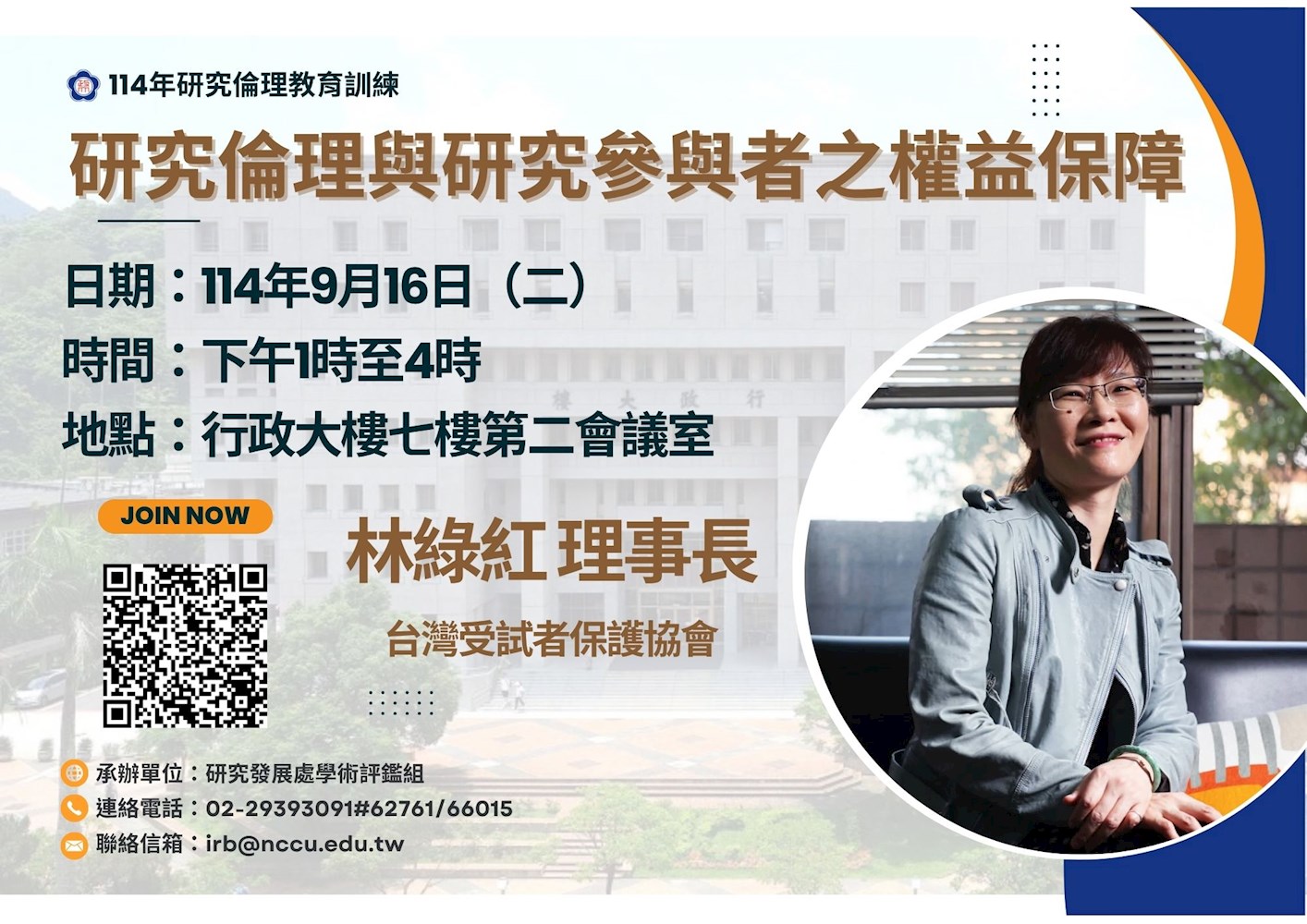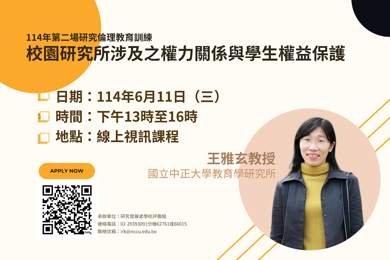 本校訂於114年6月11(星期三)舉辦「114年第二場研究倫理教育訓練」,活動訊息詳如說明,敬請轉知所屬教研同仁踴躍報名參加